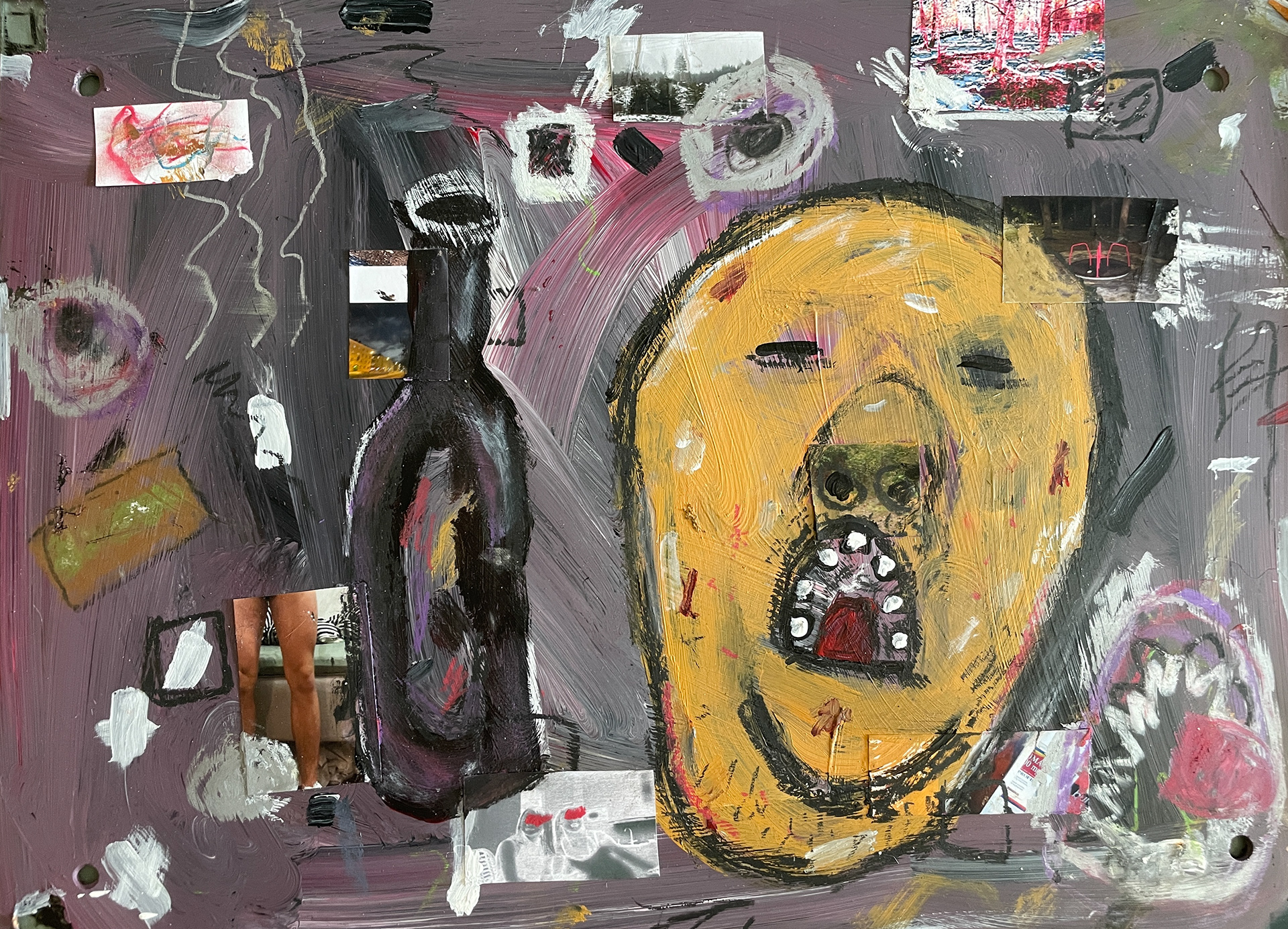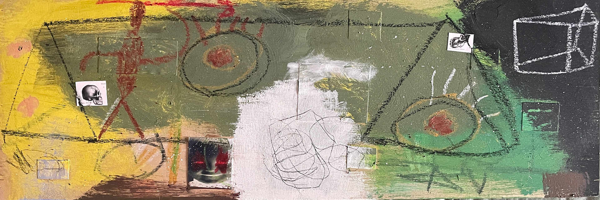 acrylic, inkjet print, oil pastel and pencil on wood
