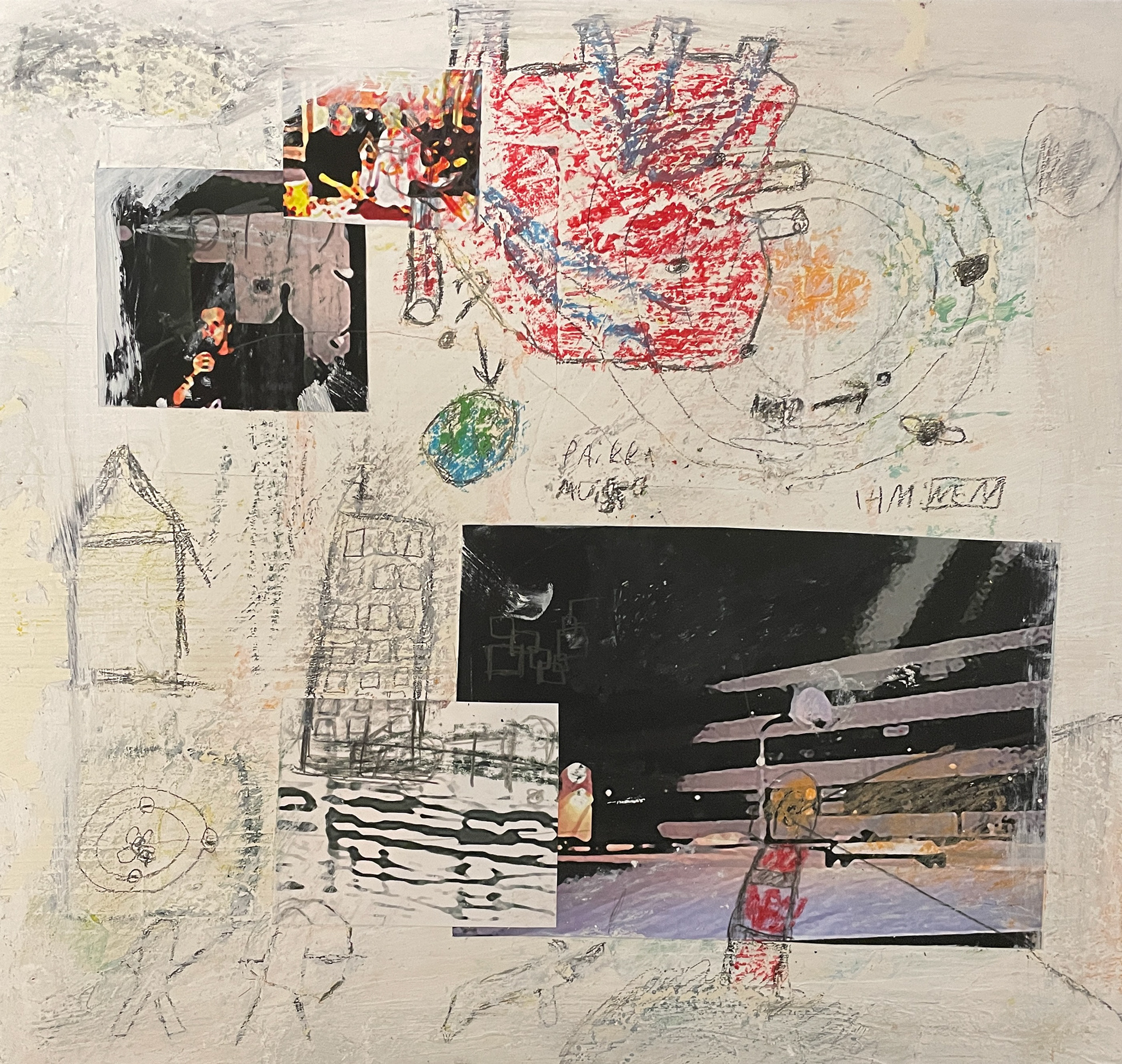 acrylic, inkjet print, oil pastel and pencil on canvas